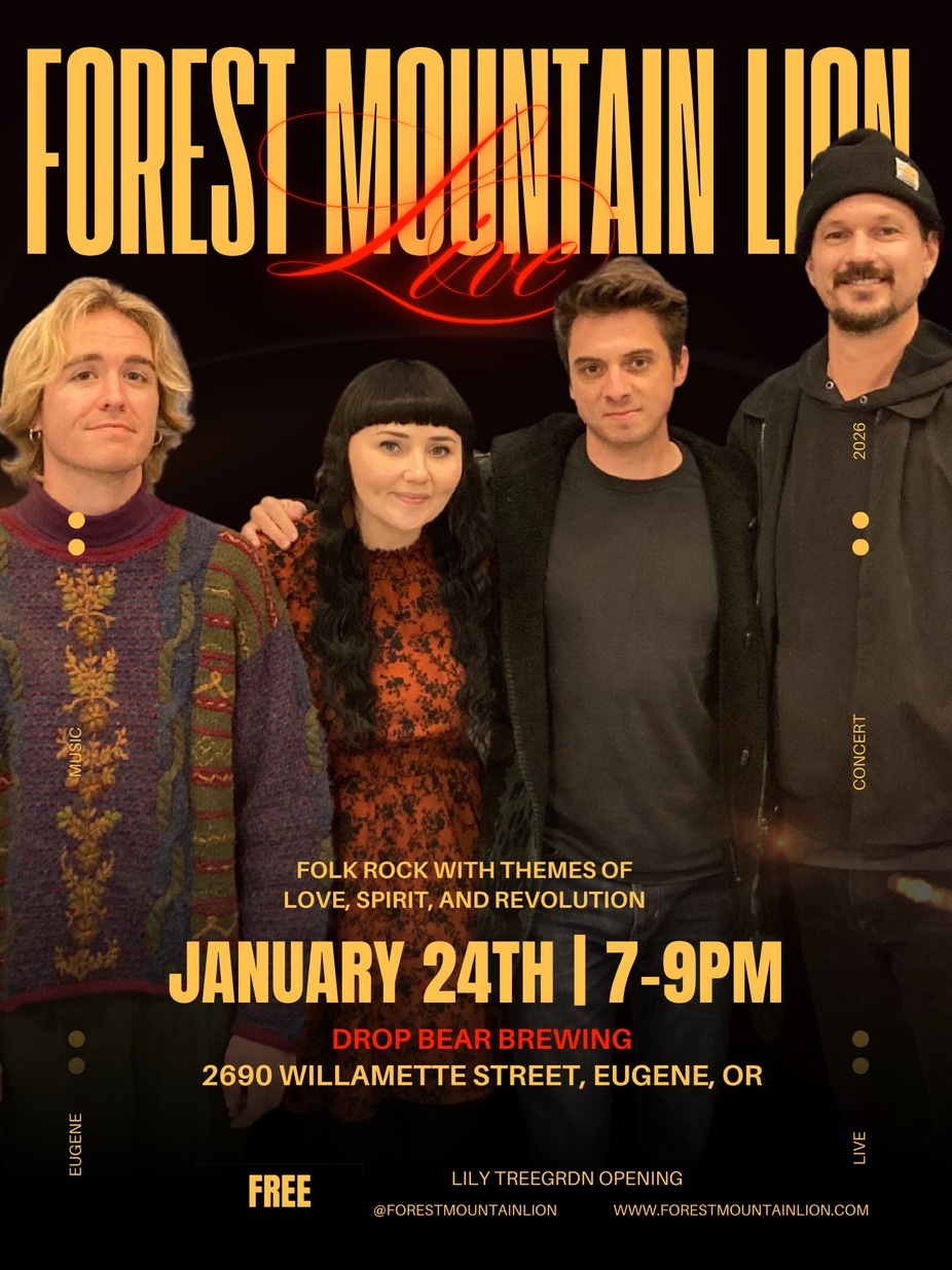 Join us for an unforgettable Saturday night as Forest Mountain Lion takes the stage with their powerful folk rock sound—woven with themes of love, spirit, and revolution.